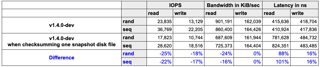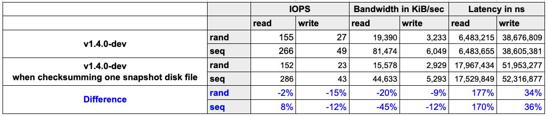 For detecting data corruption, checksums of snapshot disk files need to be calculated. The calculations consume storage and computation resources. Therefore, the storage performance will be negatively impacted. In order to provide a clear understanding of the impact, we benchmarked storage performance when checksumming disk files. The read IOPS, bandwidth and latency are negatively impacted.