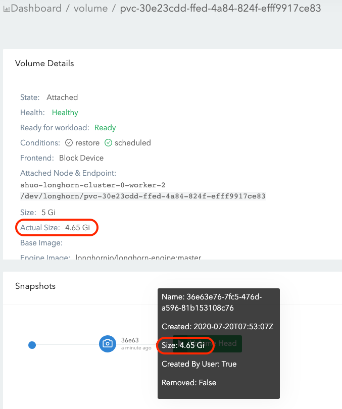 size is 5Gi and the actual size is almost 0.actual size is not exactly 0.actual size is still 2Gi.