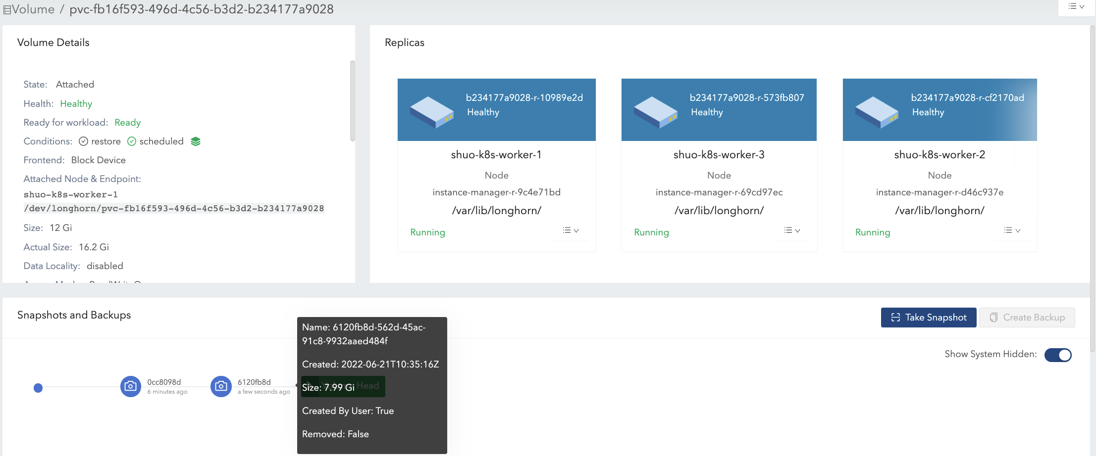 actual sizeis not shrunk after deleting the 4 Gi data. Longhorn is a block-level storage system. Therefore, the deletion in the filesystem only marks the blocks that belong to the deleted file as unused. Currently, Longhorn does not support TRIM/UNMAP operations, so thediscardmount option orfstrimin the filesystem layer cannot reclaim the unused blocks. In consequence, the actual size of Longhorn volumes cannot be shrunk in this case.